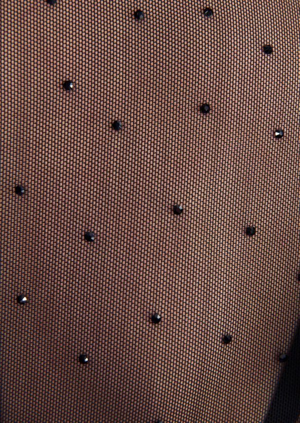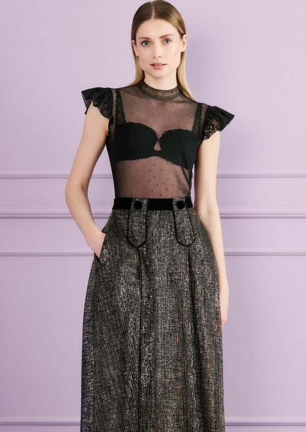 This bodysuit with short ruffled sleeves, crafted from sparkling crystal tulle, is the perfect balance of glamour and allure – especially when styled as boldly as we’ve done here, worn sheer over lingerie. It’s a daring statement piece made for unforgettable party nights. Yet, its versatility makes it just as compelling in more refined pairings: replace a traditional dirndl blouse with it, layer it under sleeveless silhouettes, or style it beneath a sharply tailored tuxedo jacket, allowing just a subtle glimpse of lingerie to peek through.