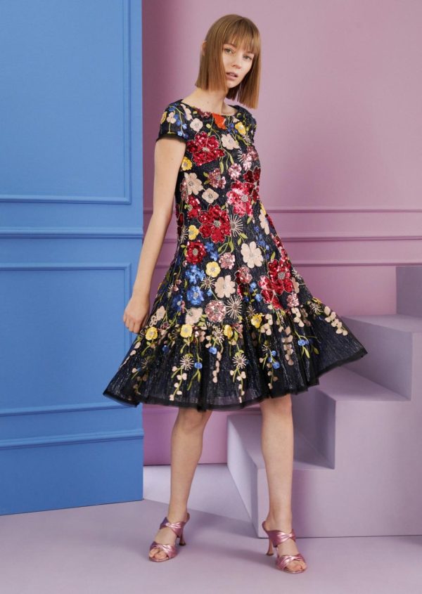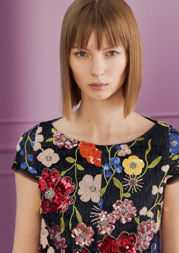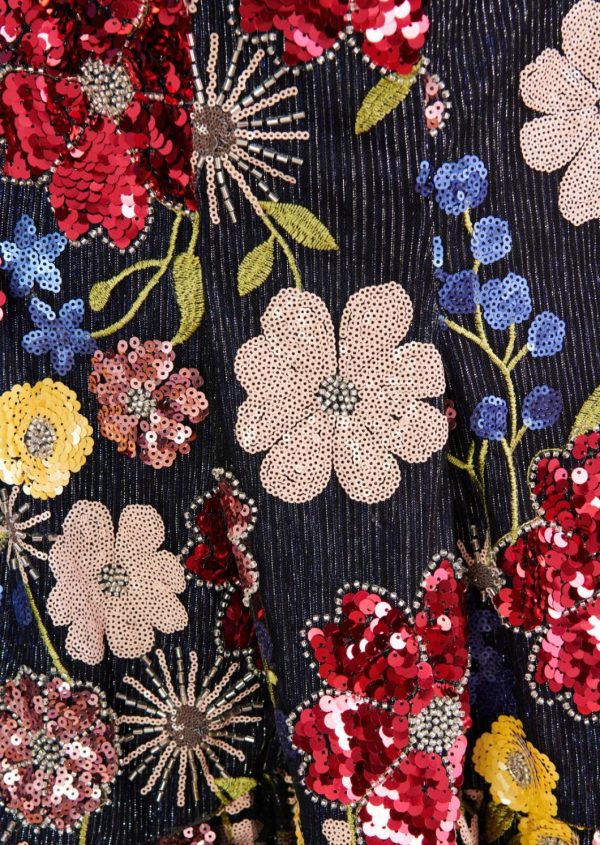 This knee-length cocktail dress with short sleeves and a subtle round neckline is a great piece for your next event: thanks to the loose fit, you never feel restricted. Despite this, it still gently follows the body’s silhouette. A wide flounce at the hem adds even more pizzazz when dancing. In this variation made of exciting sequin embroidery, you will be a sparkling eye-catcher anyway. But, at the latest, when you confidently conquer the dance floor, no guest will be able to look away.