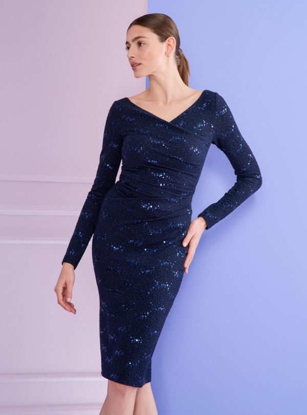 Sometimes elegant understatement is the way to go. Nevertheless, you shouldn’t hide away. This cocktail dress achieves this balancing act perfectly with its knee-length cut and long sleeves. Draped folds put the spotlight clearly on the waist. But the look remains stylish and considered. The fabric, a sparkling jersey, reflects the light beautifully. Wear this dress to a charity event, friend’s wedding, or to a concert on the philharmonic. Team with plain pumps or vertiginous high heel strappy sandals.