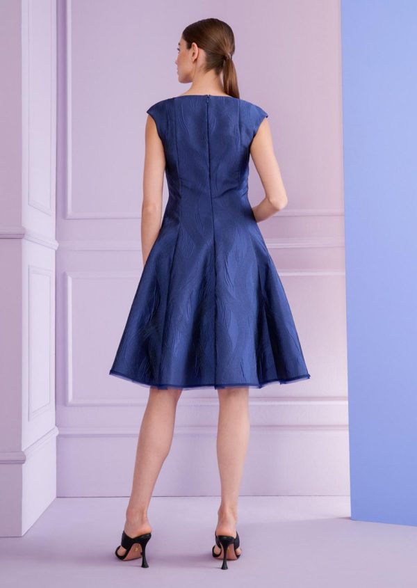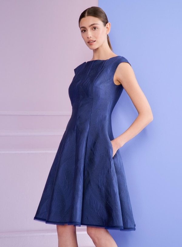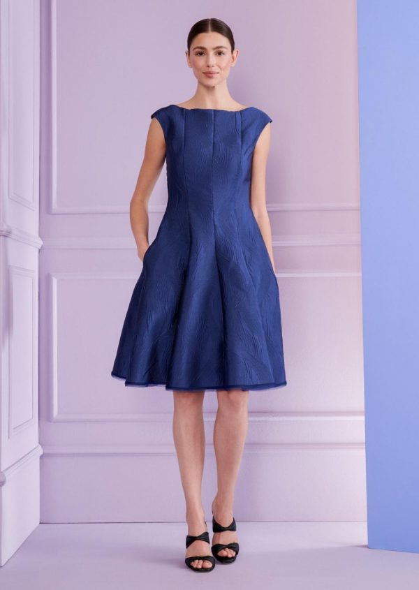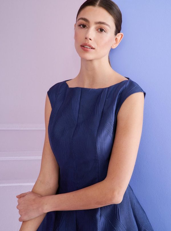 As a wedding guest, you can still say “I do!” – at least when it comes to your spectacular outfit. With this classic cocktail dress, you can look amazing as a wedding guest without stealing the show from the bride. The silhouette is elegant – characterized by the high-fastening bateau neckline and the swirling skirt that loosely skims the knees. The beautiful fabric, a jacquard in royal navy blue, flatters your complexion. During the ceremony, pair it with a matching coat and subtle court shoes, then later for the party, switch to bold statement heels.