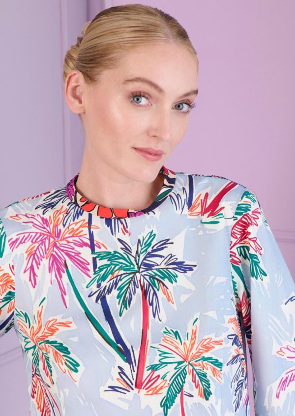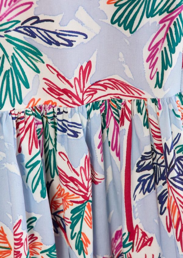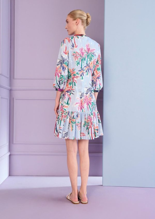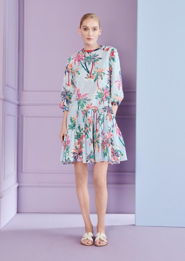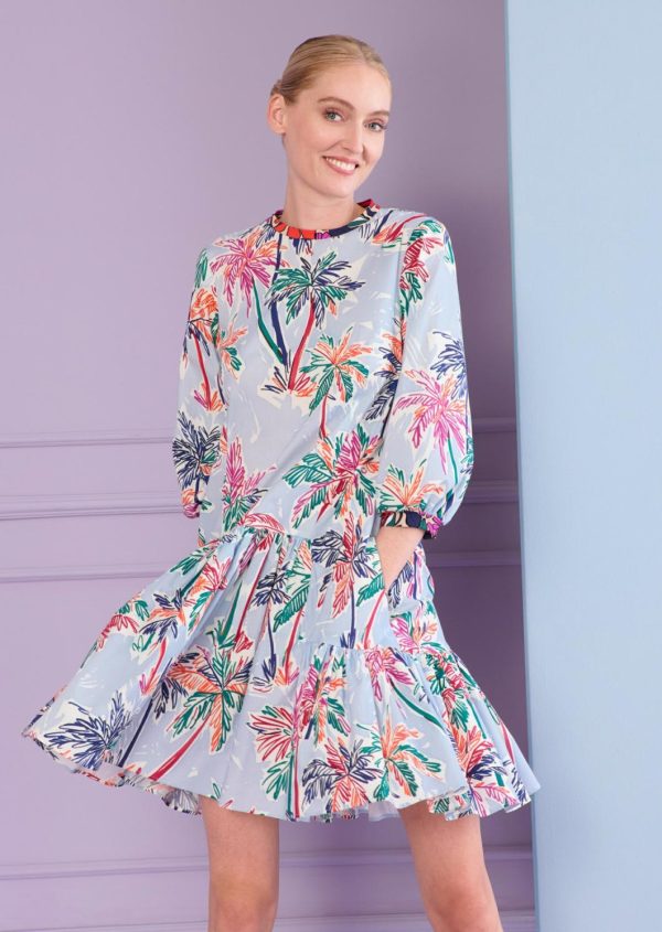 this day dress with its casual and relaxed flair will inspire you. the leightweight fabric, the fresh palmtree print, the wide blousy sleeves and the wider cut are already enough to appeal, and the clever construction of the dress creates a soft volant at the front. deep side pockets add a dash of cool understatement. wear this summer dress with flats during the day in the city, but also with pumps at the next family celebration.