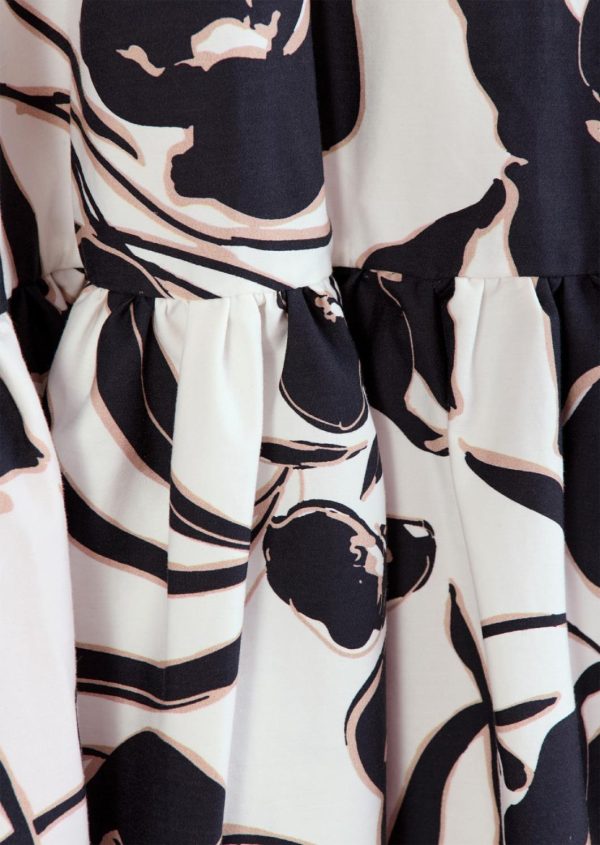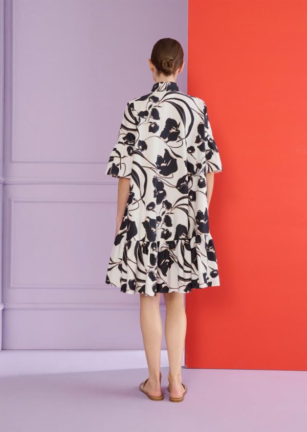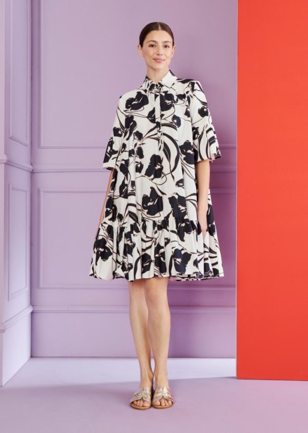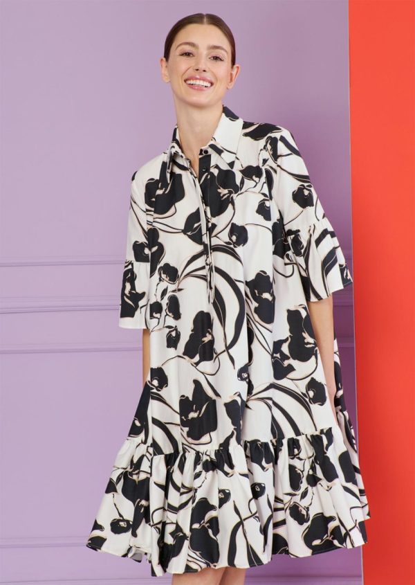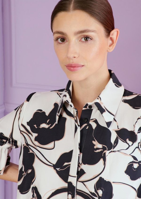 On hot days, a light breeze is always a welcome way to cool off. This short day dress pulls off the same effect even on calm days. This is thanks to the oversized cut which is never too tight or restricting. Plus, it features beautiful details: wide trumpet sleeves add a lovely eye-catching highlight. The shirt collar and button placket give it a casual look. We made it from summery flower vine cotton with a beautiful floral print. A relaxed look for a city trip in the south, an outdoor lunch on the weekend and of course, also for an after-work drink in high summer.