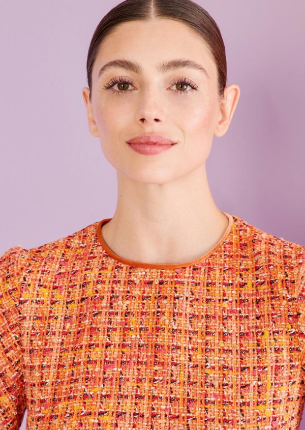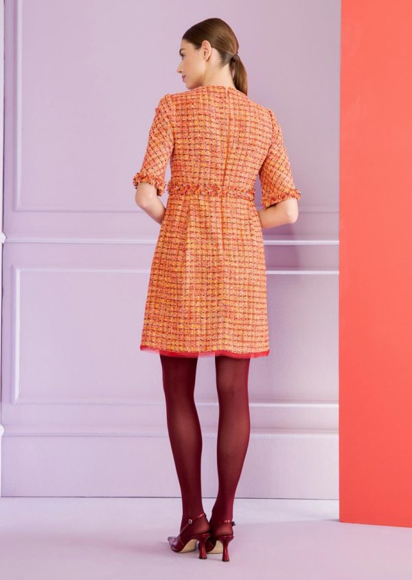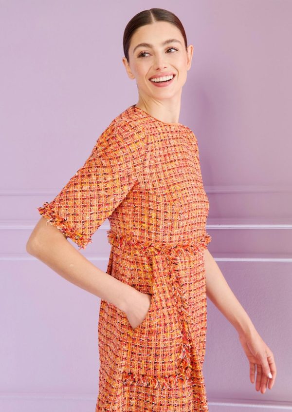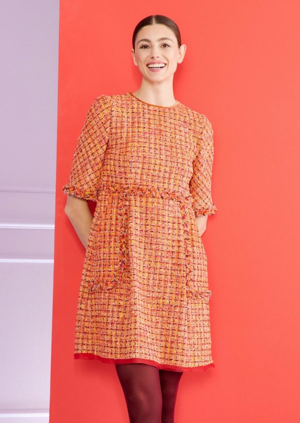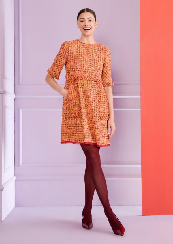 Wear this beautiful tweed day dress, and you will look amazing as your most relaxed self at every family party. Even the worst holiday stress will bounce right off you. How so? Because this dress has everything you need to get through the day feeling relaxed. The cut of the knee-length design is loose yet still showcases your silhouette. Fringed details and deep pockets give the dress a fresh, youthful look. Plus the super soft tweed guarantees feel-good comfort – especially on cooler days. Pair it with simple ankle boots and subtle jewelry and make yourself comfortable.