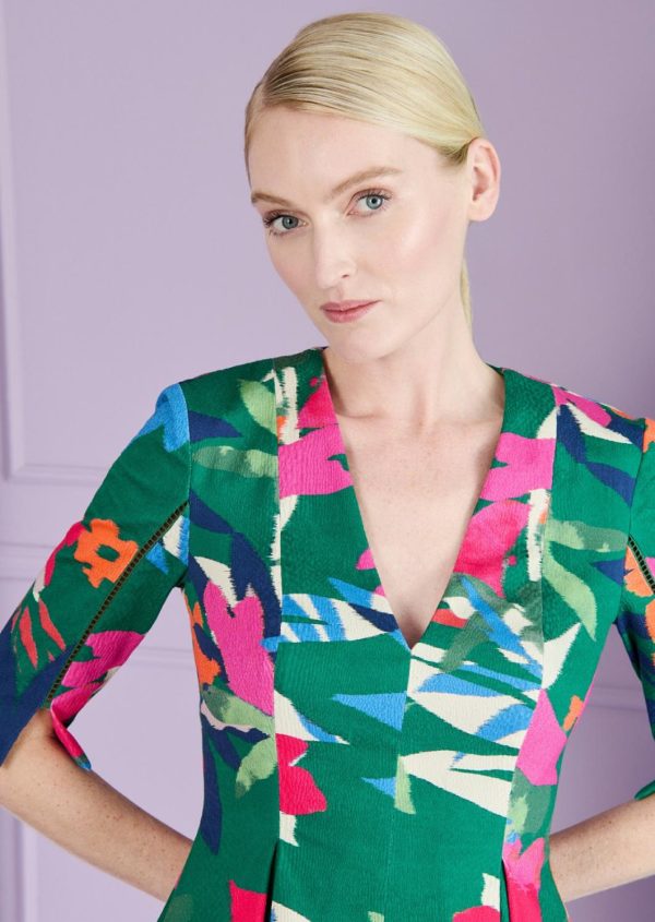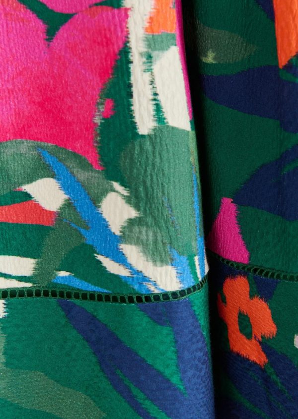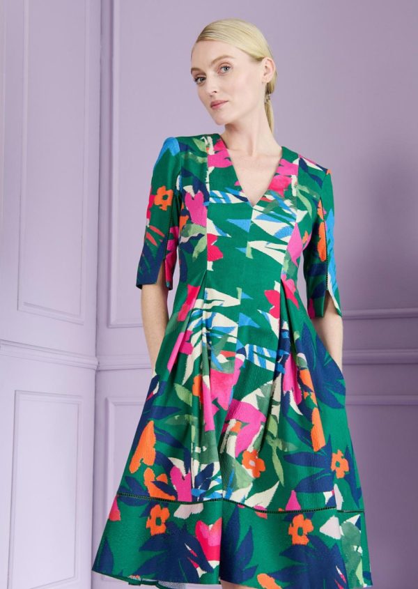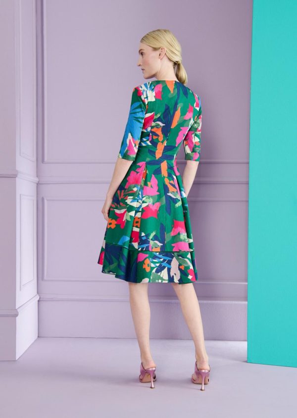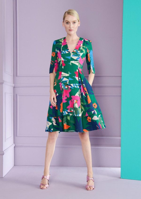 In this day dress, summer will bloom just that bit brighter. We made it from a lightweight printed cotton fabric which features a lovely floral pattern. The silhouette, on the other hand, has been kept feminine and simple. The V-neckline is not particularly low. Mid-length sleeves conceal the upper arms. The knee-length, flared skirt gives it its amazing swirl. You can wear this dress as a day dress in summer, whether at work or on holiday, or of course in the evening with elegant accessories to share a cocktail with good friends.