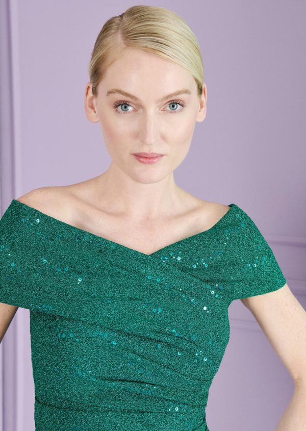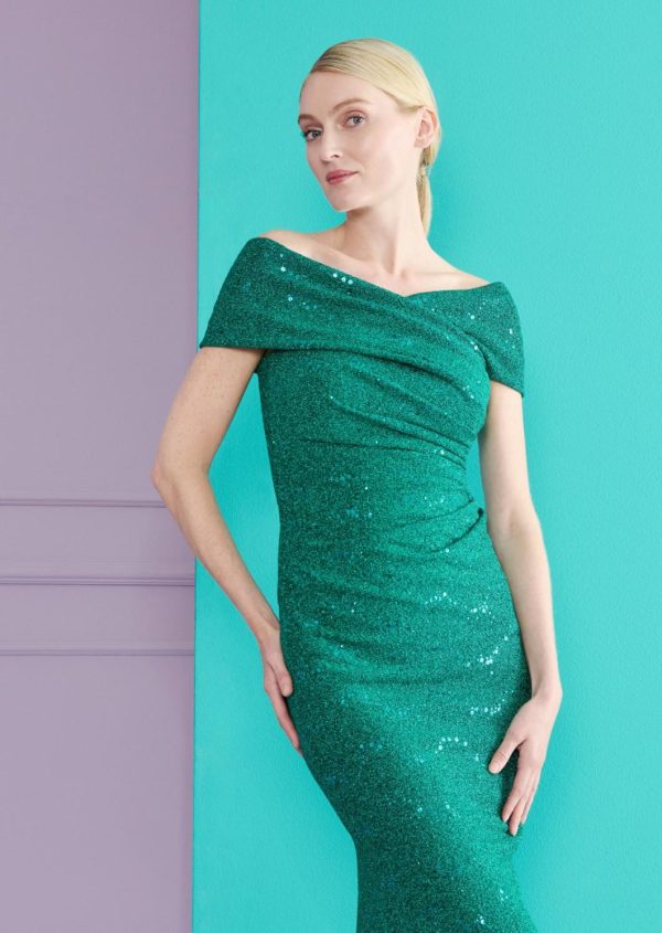 If your calendar is overflowing once again with wonderful events and you’re always out and about, then you need evening gowns that are not only versatile and easy to restyle, but also comfortable to travel in. Like this simple yet glamorous gown, for instance. The cut has plenty going for it, too. Thanks to the criss-cross drape, this evening gown accentuates your collarbones, while also covering the upper arms with a short sleeve. Intentional draping makes the waist appear slimmer. We made this floor-length gown out of comfy lurex jersey. You can go crazy and pair it with brightly colored accessories. Alternatively, wear it with a matching stole and delicate gold jewelry for an elegant look or with an exciting choker for a glamorous outfit.