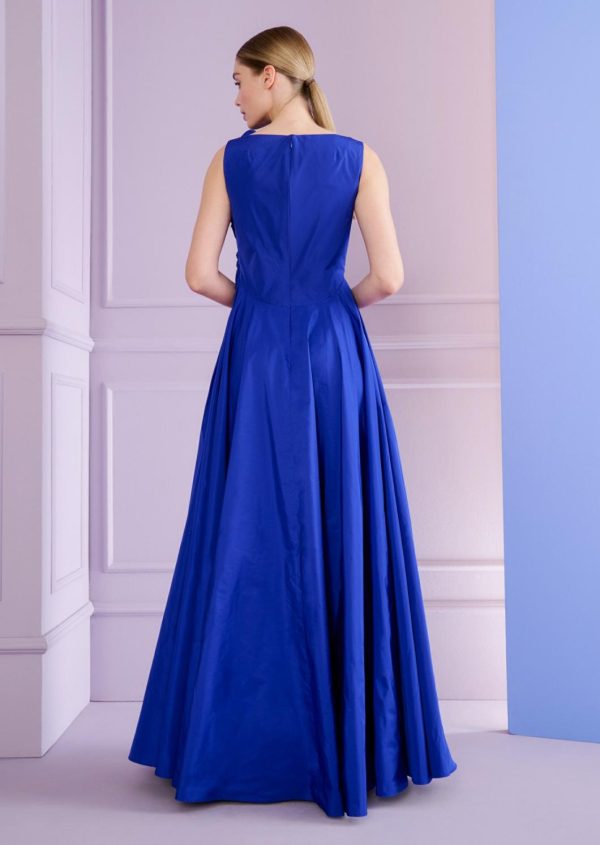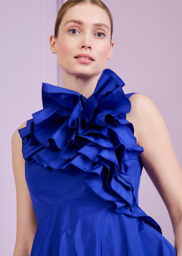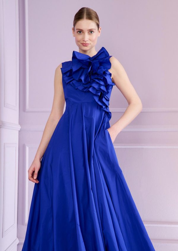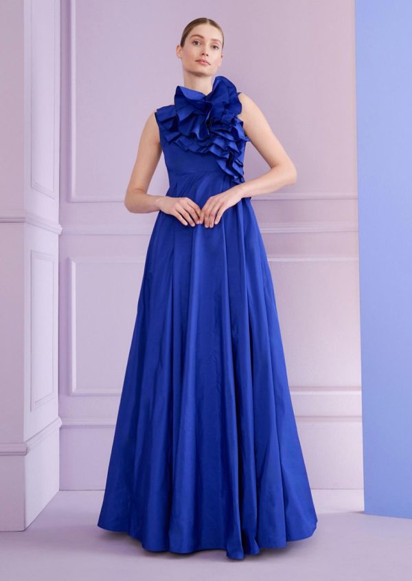 Of course, drama belongs on the stage – with this extravagant gown, however, it’s all yours! Our new evening gown made of feather-light taffeta boasts sophisticated details. The elegant high neckline certainly doesn’t hold back but instead wows with an exciting, ruffle panel that sweeps over the upper section. The waist is kept slim. Further down, the gown opens into a wide skirt – perfect for stepping out on the red carpet at the movie awards or a glamorous wedding in Ibiza or some other Mediterranean island.