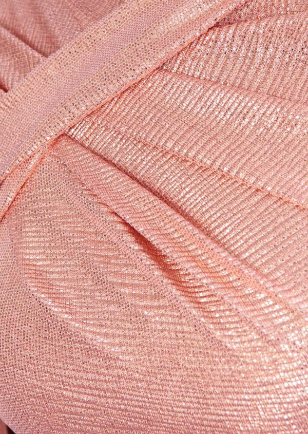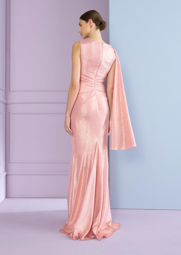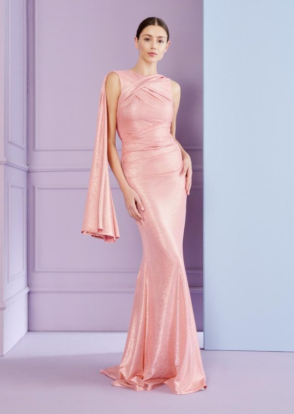 If you’re familiar with our gowns, you’ll know that intricate draping is a key component in most of our designs. In this new creation made from glamorous crystal jersey, the draping not only creates a fabulous look, it also gives the figure an incredibly well-defined shape without being too… seductive. A high neckline with crossover draping remains elegant at all times, subtly shaping the bust. Fabric pleats visually slim the waist. A short cape section adds a touch of drama. This dress is an exciting look for any gala, major festival, or wedding banquet.