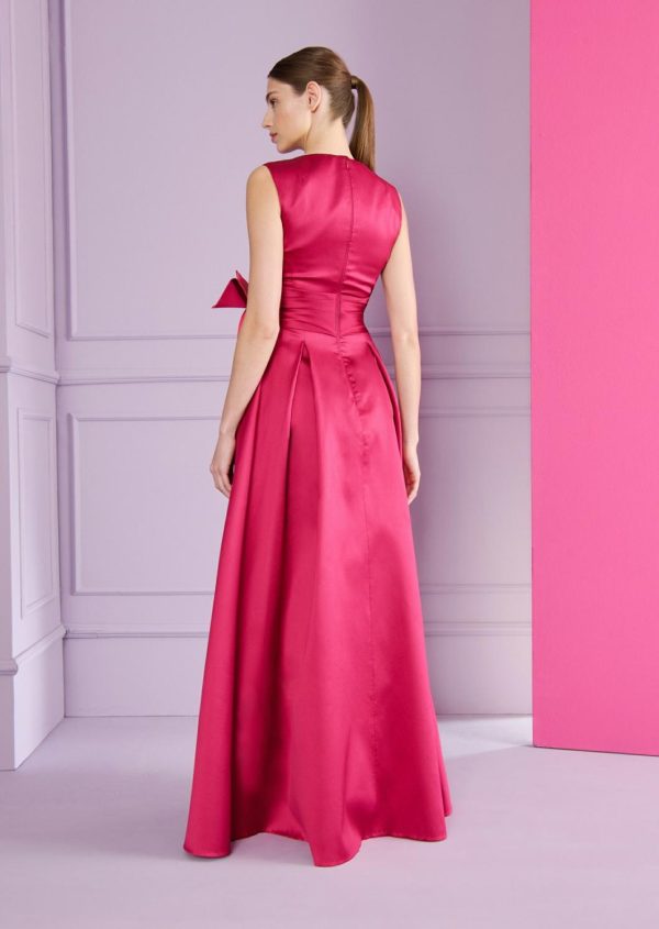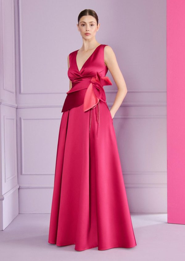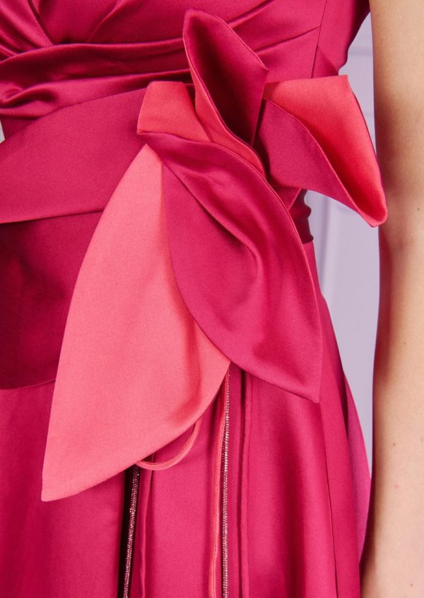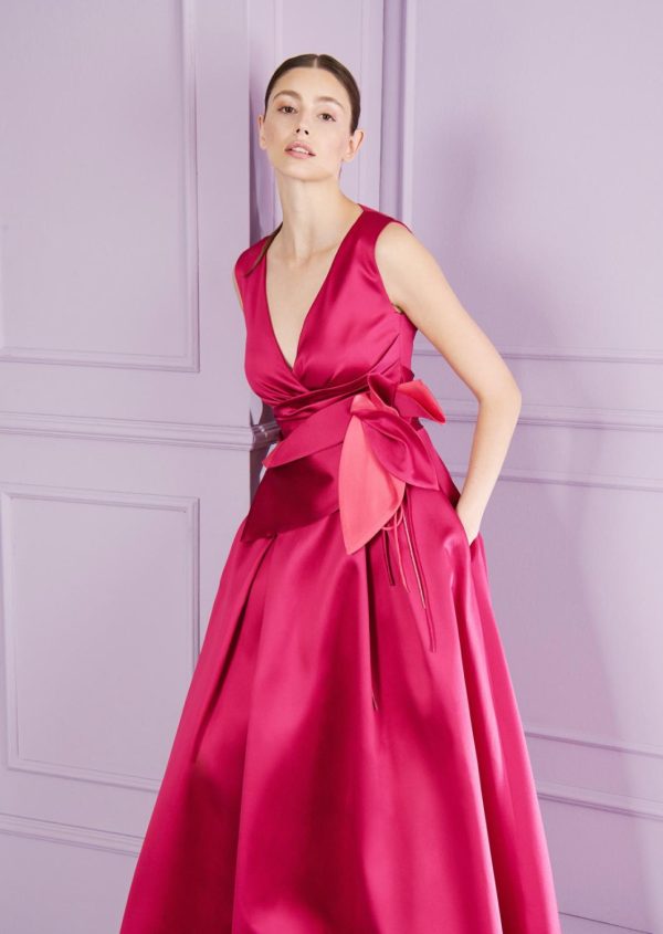Flowers will never fail you. That was the motto for one of our previous runway collections. And you won’t be disappointed this season, either. A gorgeous, crystal-embellished fabric flower adorns the waist of this floor-length gown. Having captured everyone’s attention, the gown’s accentuated neckline and sweeping, bias-cut skirt will hold their gaze. For this design, we chose a lightweight and very specail radzimir taffeta with radiantly beautiful colors. When it comes to accessories, almost nothing is needed. Simply add a pair of pretty earrings and you’ll be ready to dance the night away!