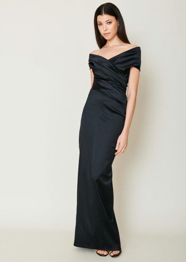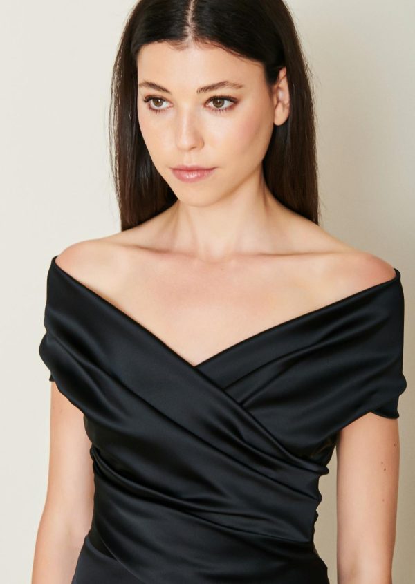 this dress, made of our bestseller material, a shimmering satin duchesse, is going to surprise you again and again. tokara4 captivates first and foremost with the great crisscross draping, which, while not showing too much, tones the shoulders and collarbone emphasizing why this dress seems so exciting in its restraint. the artistic sleeve solution is also a highlight here, which on the one hand is loosely draped, but at the same time simply makes those critical areas under the arm disappear. on top of that our iconic draping naturally narrows your waist. to the festival, that exquisite soiree, or simply on the red carpet tokara4 will impress almost everywhere.