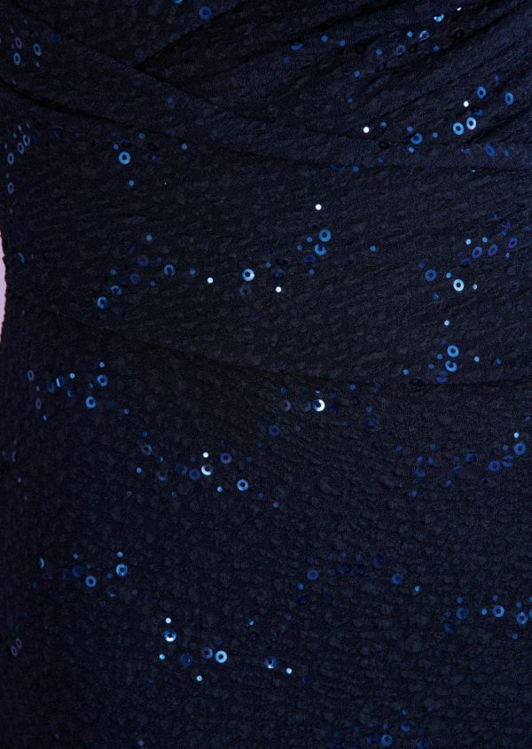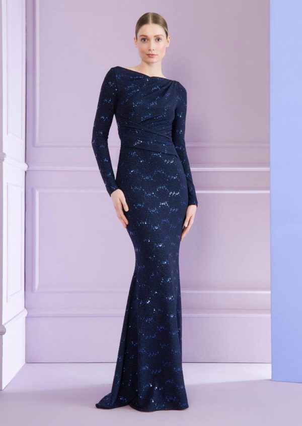 What makes an amazing evening gown? We ask ourselves this often when working on our collections. Glamorous materials with a beautiful shimmer are always a good start. We then add sophisticated drapes to flatter the figure, as well as a slightly flared, floor-length mermaid skirt. This piece ticks all the boxes… and doesn’t stop there! The cloqué jersey fabric has a majestic glow. long sleeves add to the elegant, feminine look, rounded off by an high bateau neckline. Wear it with a silver-colored clutch and metallic sandals.