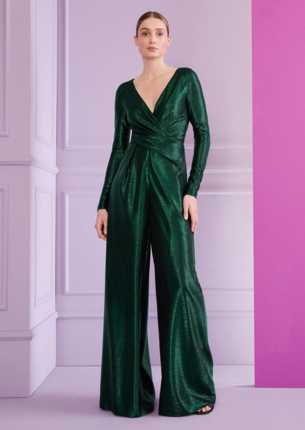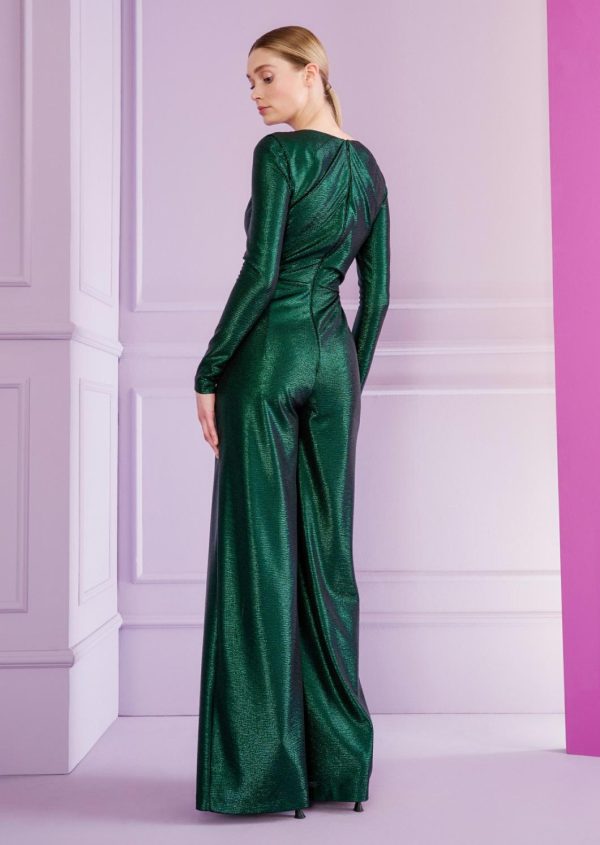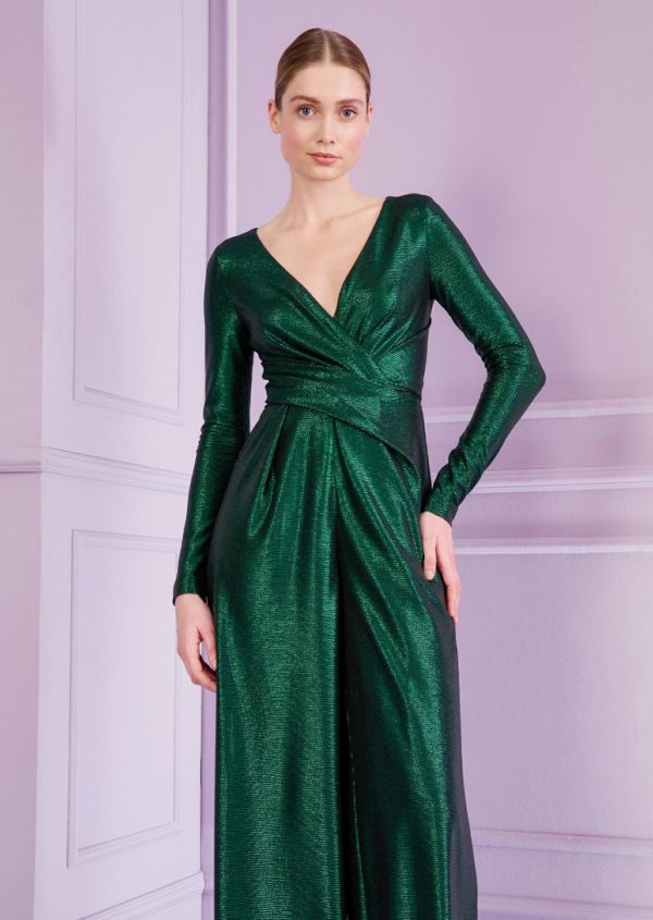 This jumpsuit will make you a number one hit at any party. It is made of a flowing mirrorball stretch. Easy to wear, with a beautiful sheen, it follows your movements naturally. The wide leg and sophisticated draping are feminine and elegant and bring a certain softness to the look. The décolleté is accentuated by the beautiful V-neckline, but does not reveal too much. Long sleeves round off the elegant, casual look. Perfect for a rehearsal dinner for an upcoming wedding as well as a cool red-carpet event during a film festival.