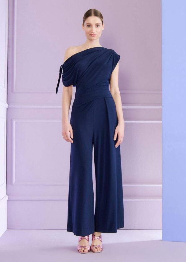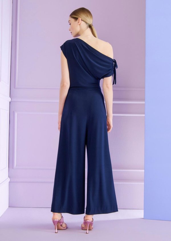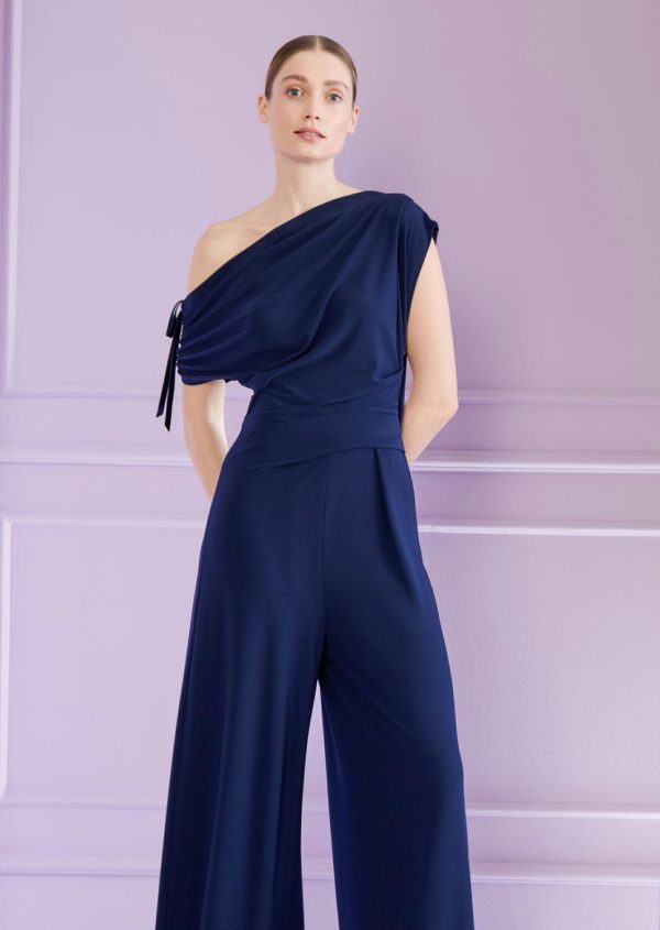 Casual or elegant? Our new versatile jumpsuit, made of a flowing jersey crêpe, can do both. The waist is accentuated to make it appear slimmer. The asymmetric sleeves create an especially exciting look. On one side, the sleeve can be bunched up to taste using a drawstring. Thanks to the wide bateau neckline, you can let the top so casually but oh so seductively slide down over your shoulders. The wider cut leg is both feminine and super elegant. And in this modern midi-length design, you can also show off your favorite evening stilettos.