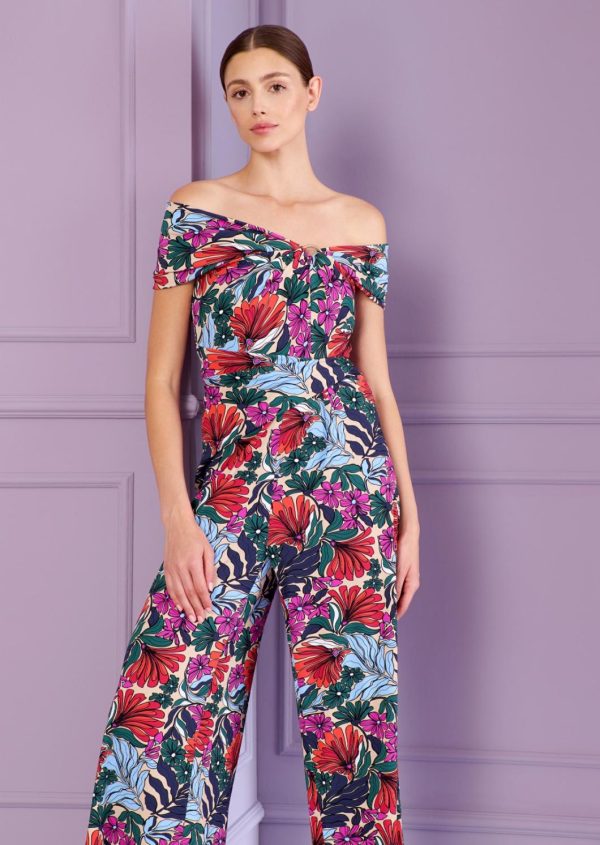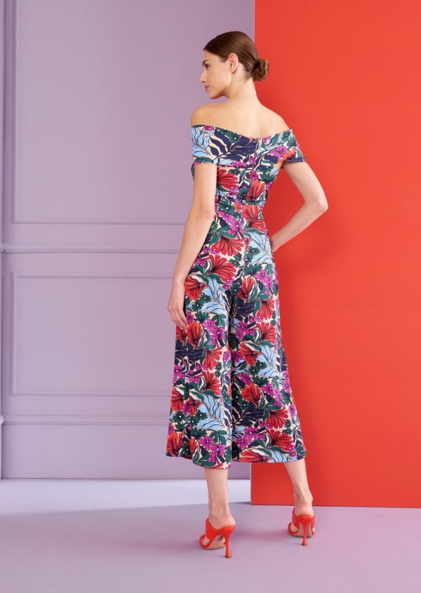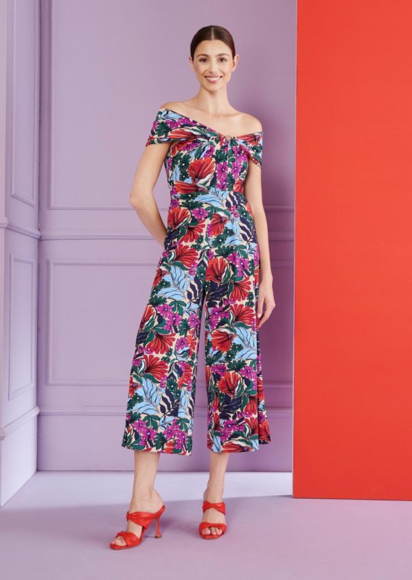Put a ring on it! With this midil ength jumpsuit, we are writing a lover story like no other – golden ring included. It might not be on your finger, but it decorates the shoulder drape as a shimmering detail. The two drapes are entwined within it, producing the sleeve detail. A further drape at waist height creates a stunning silhouette. The wide-cut leg completes the feminine look. We made this jumpsuit from a flowing floral jersey fabric which is very comfortable to wear. The added stretch means you can even enjoy a long summernight dinner in full comfort.