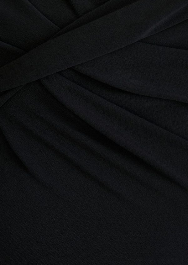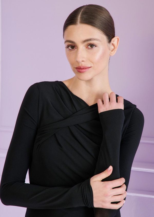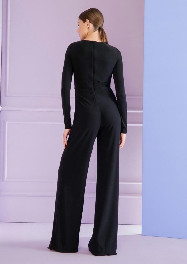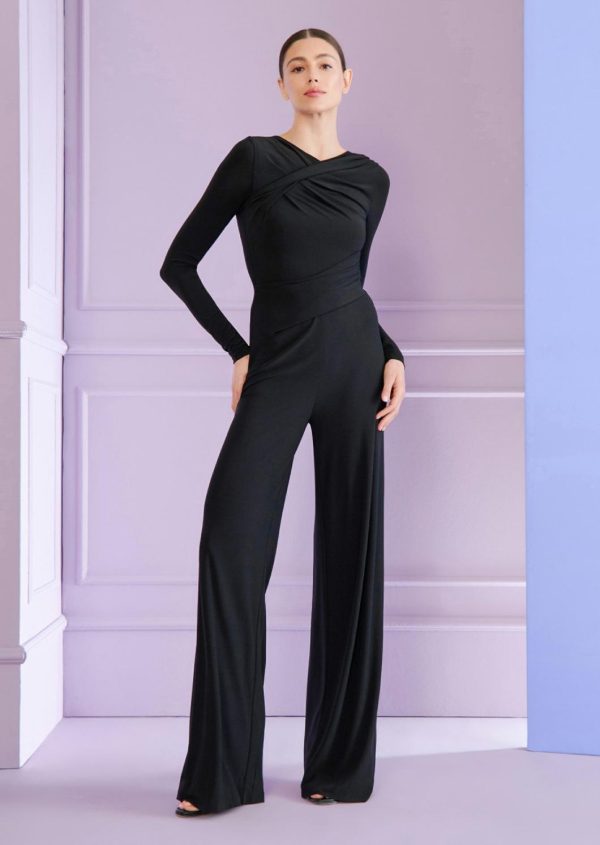 If you’re familiar with our gowns, you’ll know that intricate draping is a key component in most of our designs. Naturally, this also works with jumpsuits! In this new creation made from jersey crepe, the draping not only creates a fabulous look, it also gives the figure an incredibly well-defined shape without being too… seductive. The high neckline with crossover draping remains elegant at all times, subtly shaping the bust. Fabric pleats visually slim the waist. A wide leg adds an elegant and feminine touch. This extraordinary look is ideal for the dinner at night or your next theater visit.