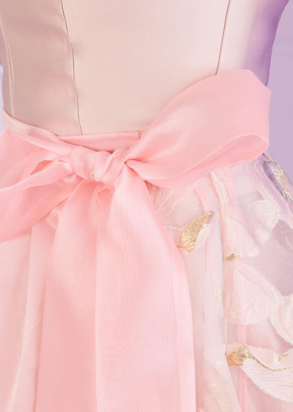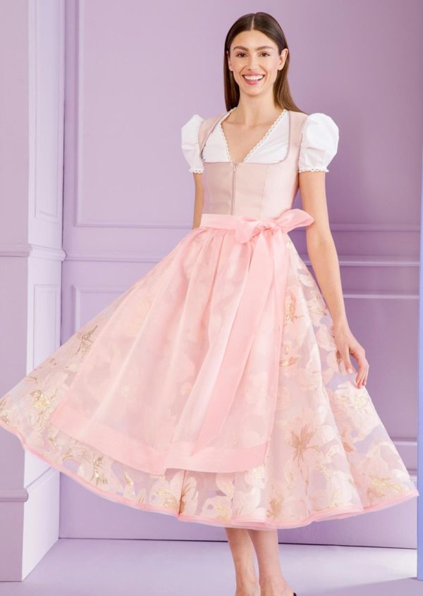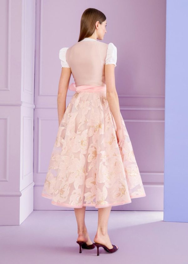 The Talbot Runhof dirndl gives your wedding guest look a certain glamorous but still traditional charm. The cut remains respectfully classic, but is re-imagined in a modern way throught the brand’s signature design aesthetic. The dirndl itself is made from a sophisticated Duchesse silk satin in marble pink and a wonderfully lightweight floral jacquard. With its soft sheen, it lends your look an opulent radiance. The delicate organza apron stylishly rounds off the ensemble and strikes the perfect balance between tradition and modernity. The practical zipper at the front makes it easy to put on and take off, while the classic cut elegantly accentuates the décolleté. The feminine midi length also creates a timeless silhouette that will look great on your big day, but is also easy to wear for the big party after the ceremony. So you can dance relaxed into the night and celebrate the happy couples love for each other.