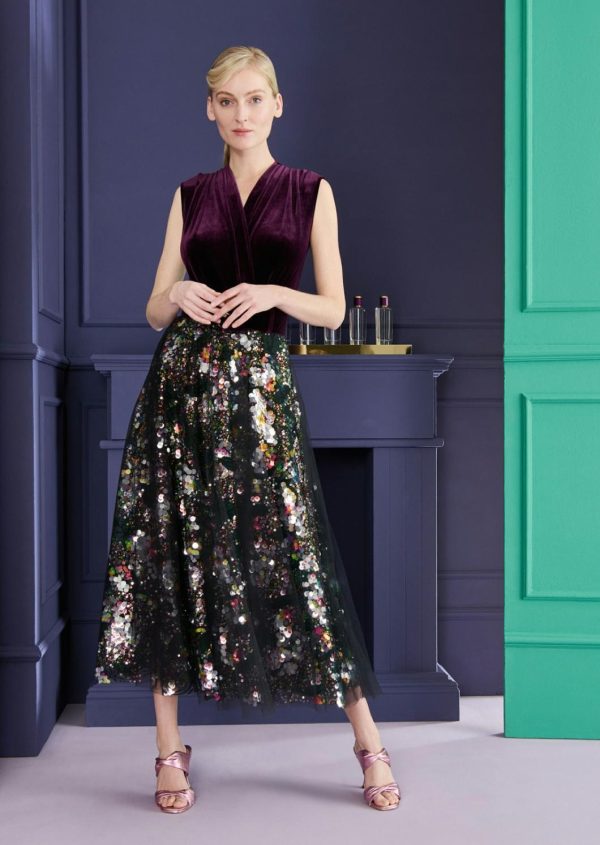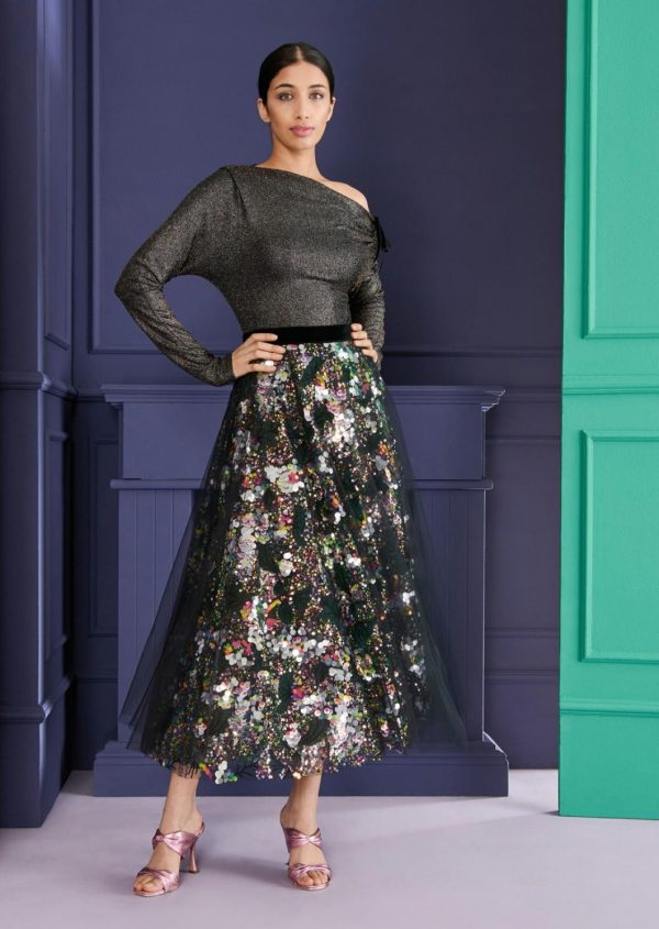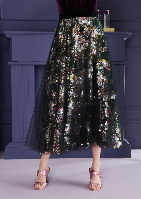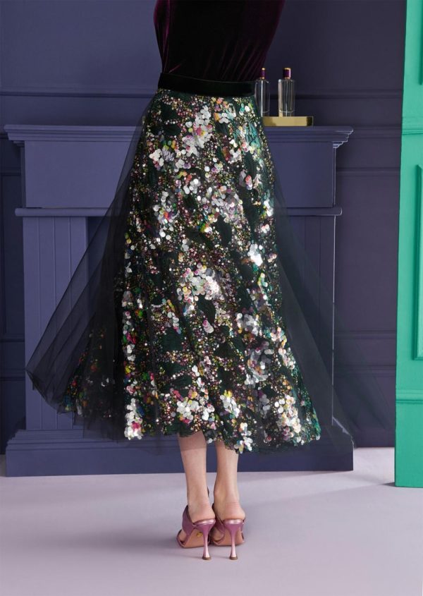 Dance through the season. Our tulle skirt is reminiscent of feather-light ballet skirts since we have used many layers of different colored tulle. We combined all of this and added sparkling sequins! These give our glamorous midi skirt its special shimmering look when it moves. In the daytime, wear it simply with casual knitwear, a wide-fit T-shirt, or a summery top. In the evening, a figure-hugging velvet top or sequins, combined with exciting heels, creates the ultimate glamor look for the opera or, of course, the ballet.