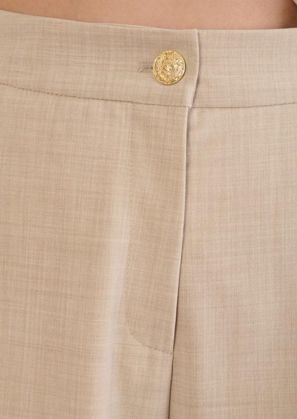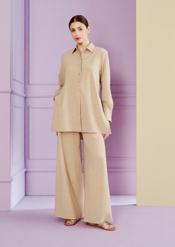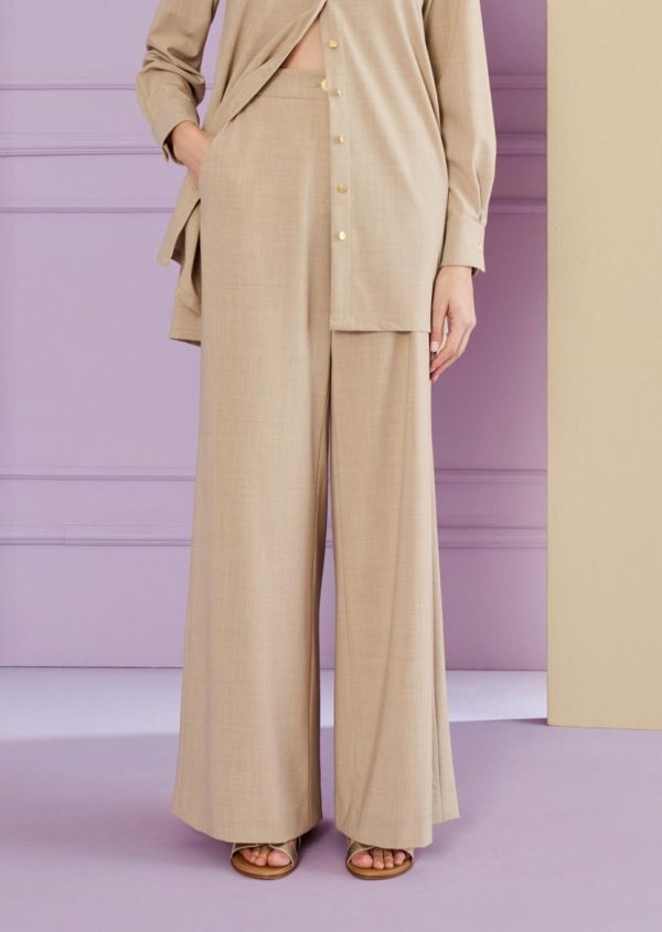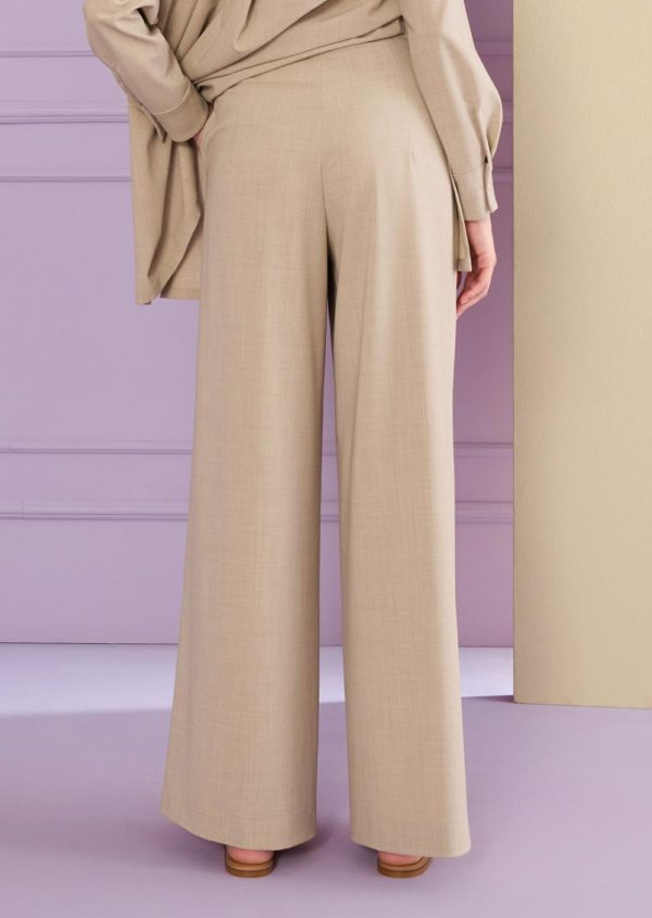 Looking for a striking pants look for the office? Then this piece is perfect for you. With a high waistband and a wider, straight leg, these pants add variety to the corporate gray look. The fabric, a lightweight Italian wool in a summery sand color tone, takes care of the rest. Wear them with a lightweight knitwear piece, a boyfriend blouse with casually turned-up sleeves, or with the matching jacket from Talbot Runhof.