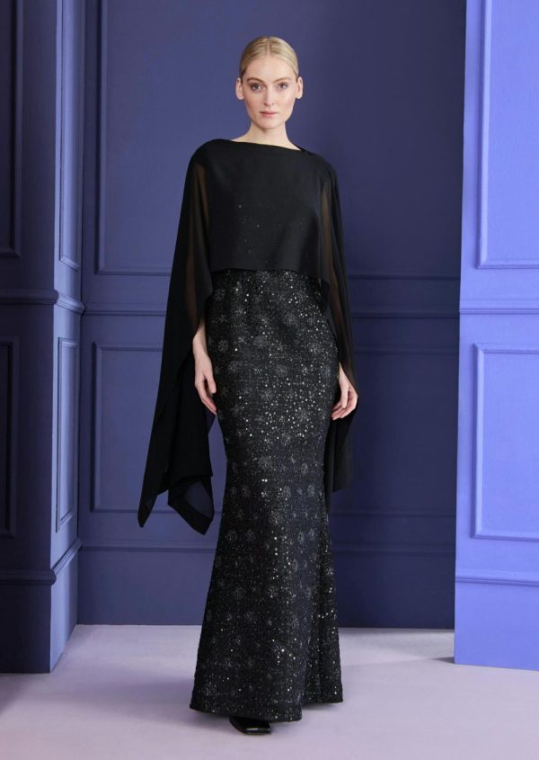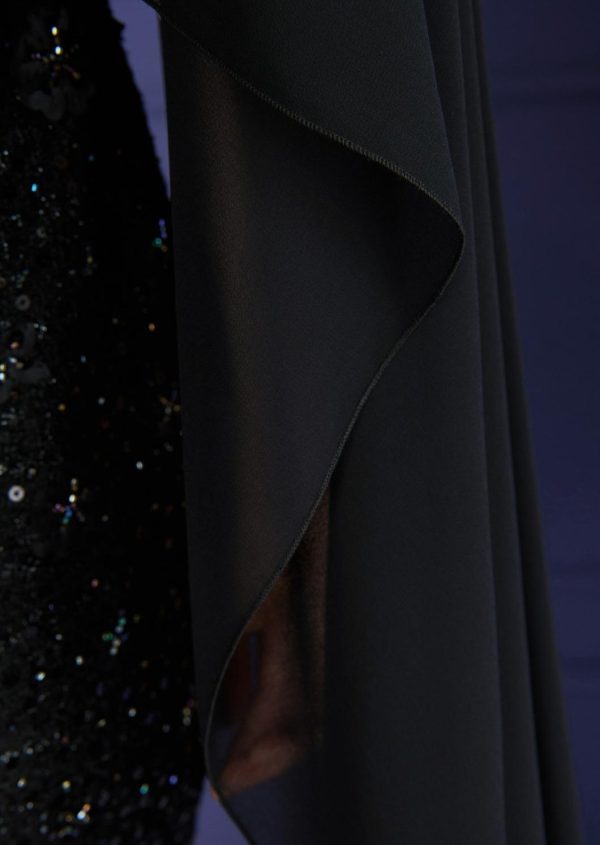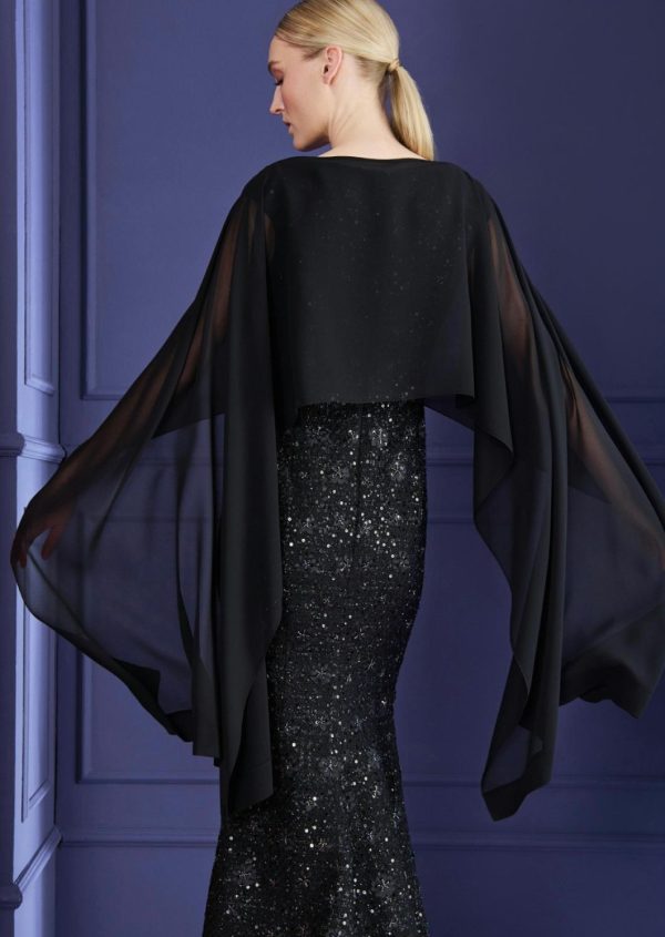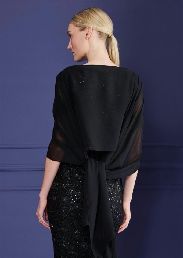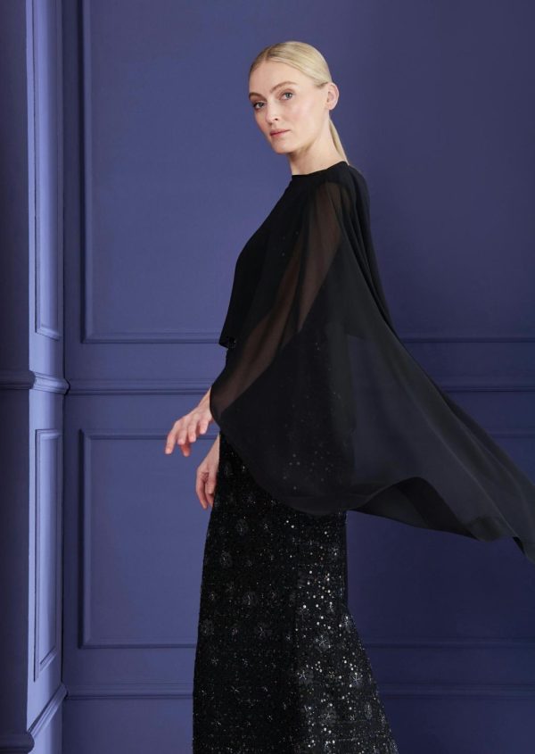 One single shawl and yet so many possibilities. On those cooler evenings or rather as a discreet protection against too much bare skin, Cia1 is the perfect companion. Our new shawl can be worn in a number of various ways thanks to the cut. Simply slip your head through and lay the soft georgette crepe gently over your shoulder. Or why not get creative with it! Throw the side shawls over one another, tie them in a knot at your side, toward the front, or behind you and this way you’ll be able to conjure up an exciting transparent top. Especially in combination with a sleek, chic evening gown you’ll continue to be able to create new and exciting looks!