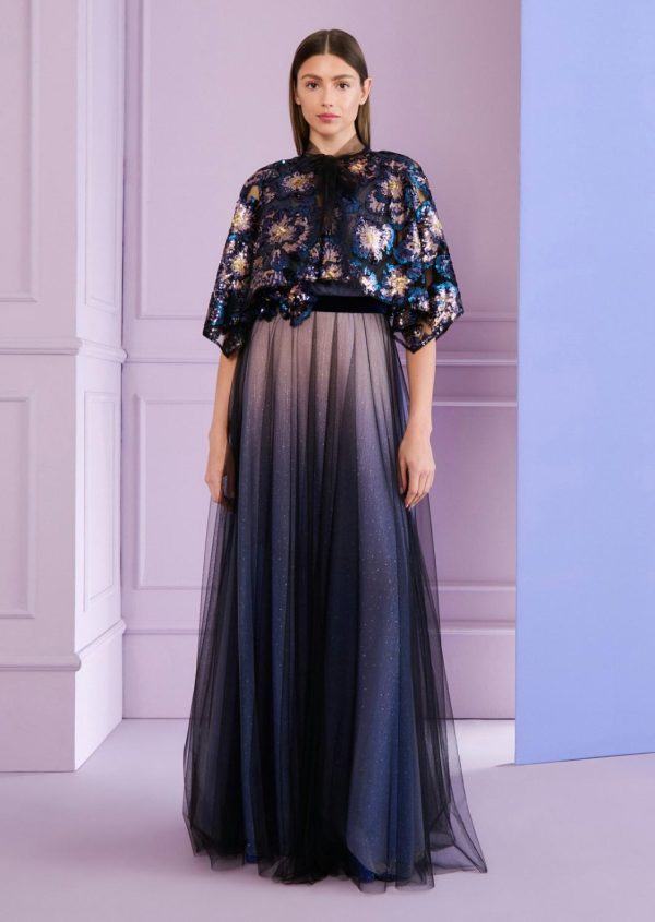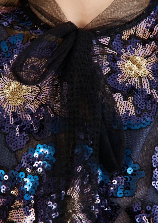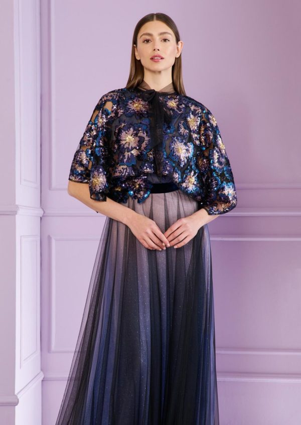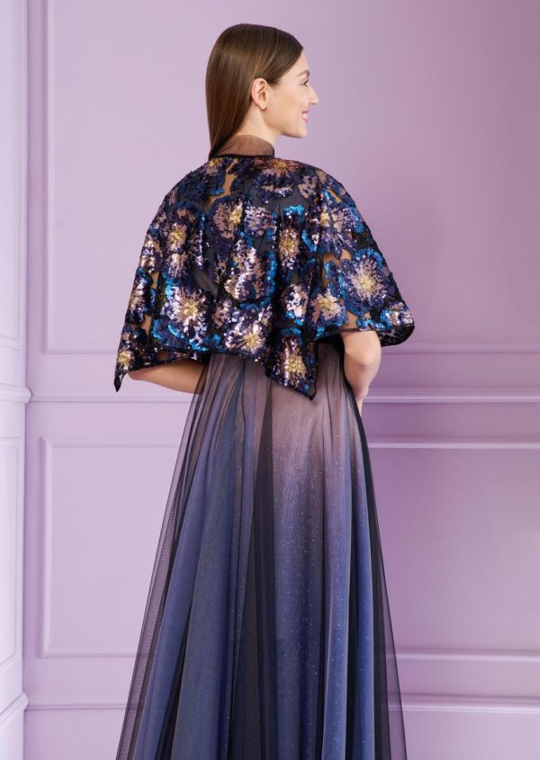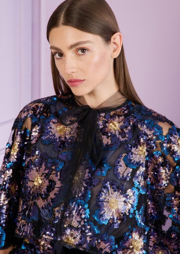 Our short bolero cape made of sparkling sequin fabric with a floral pattern exudes pure retro glamor. It drapes delicately over the shoulders and is tied at the front with a playful tulle bow. Not only does it stylishly cover your arms when you wear it with a sleeveless evening dress, it also makes an exciting fashion statement – a great eye-catcher for the next gala!