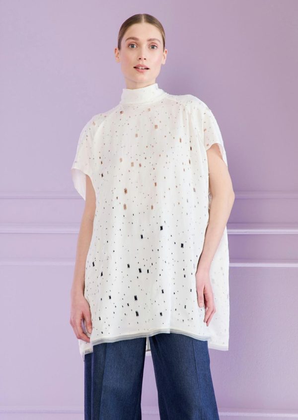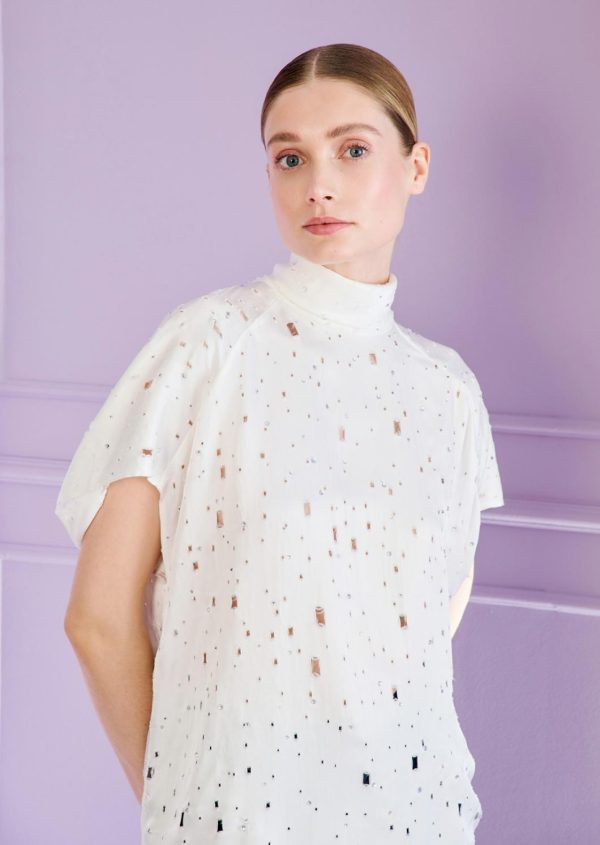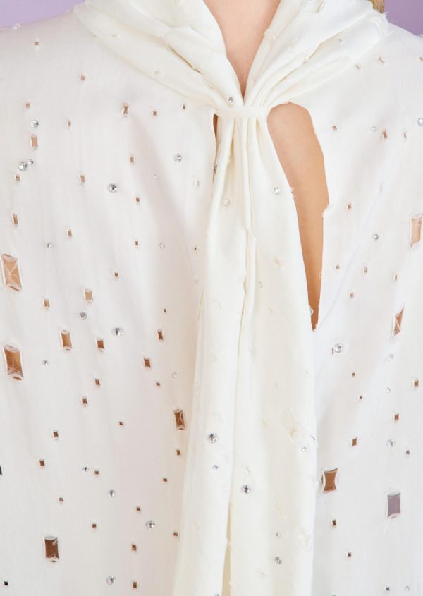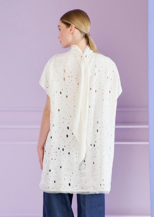 Make your top the star of your outfit. This piece makes that a breeze: The cut of this top is as extravagant as it is artistic. The back flows over the shoulders, forming delicate sleeves. From the center back, a long pussycat bow flows over the shoulder to the front, which you can elegantly drape around your neck. Combined with a simple pair of pants and high-heeled sandals, this look is quite the spectacle to behold – no matter what the occasion.